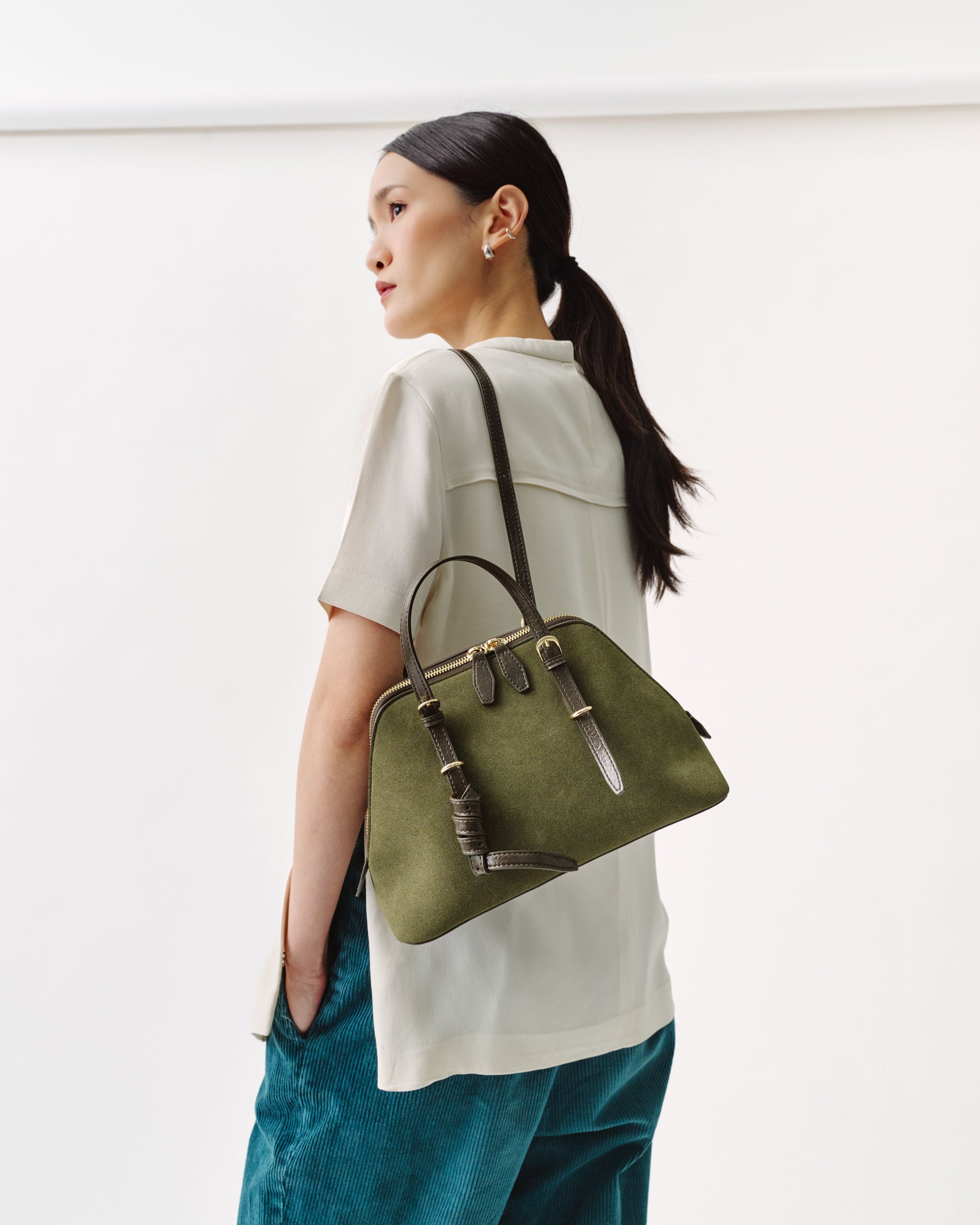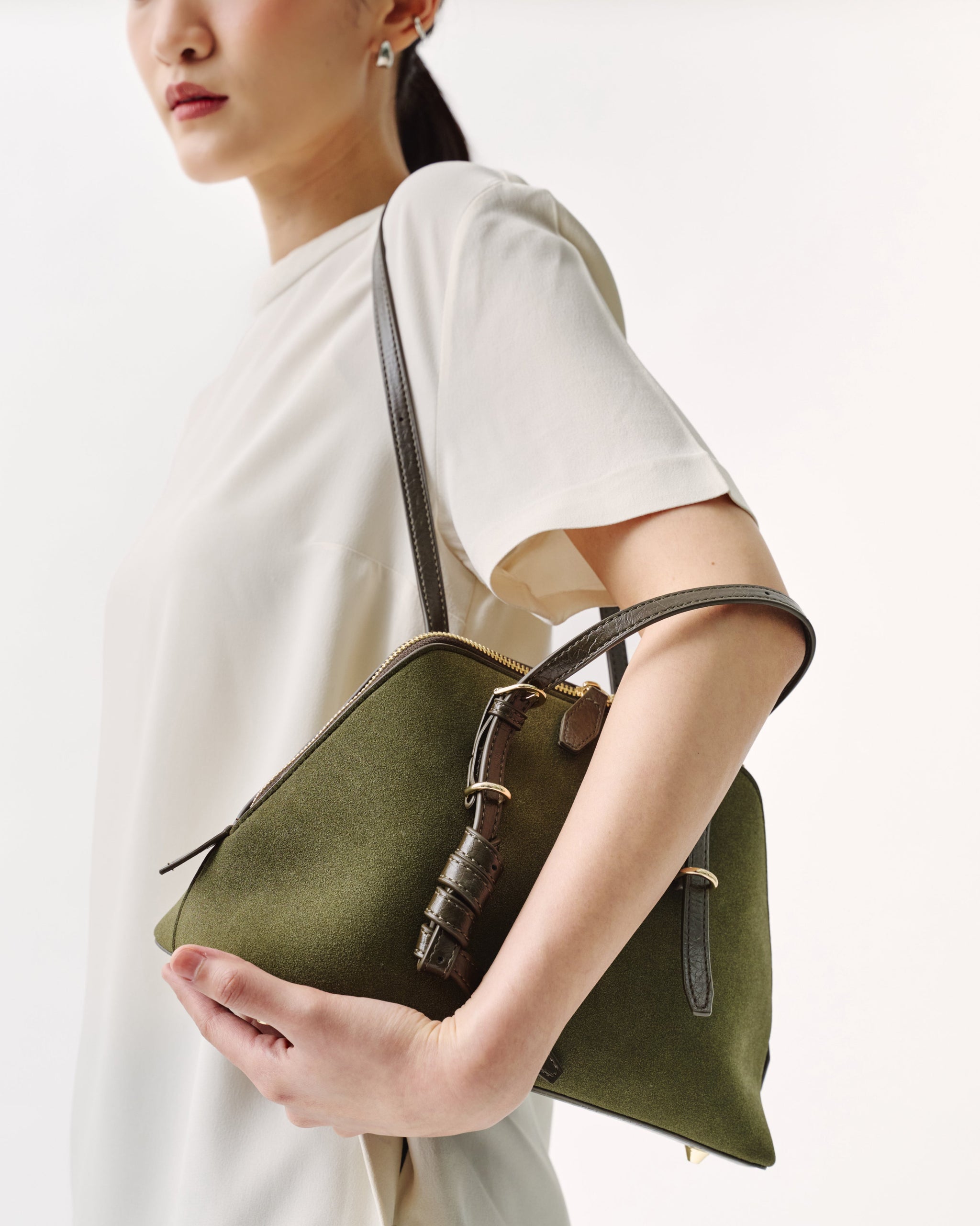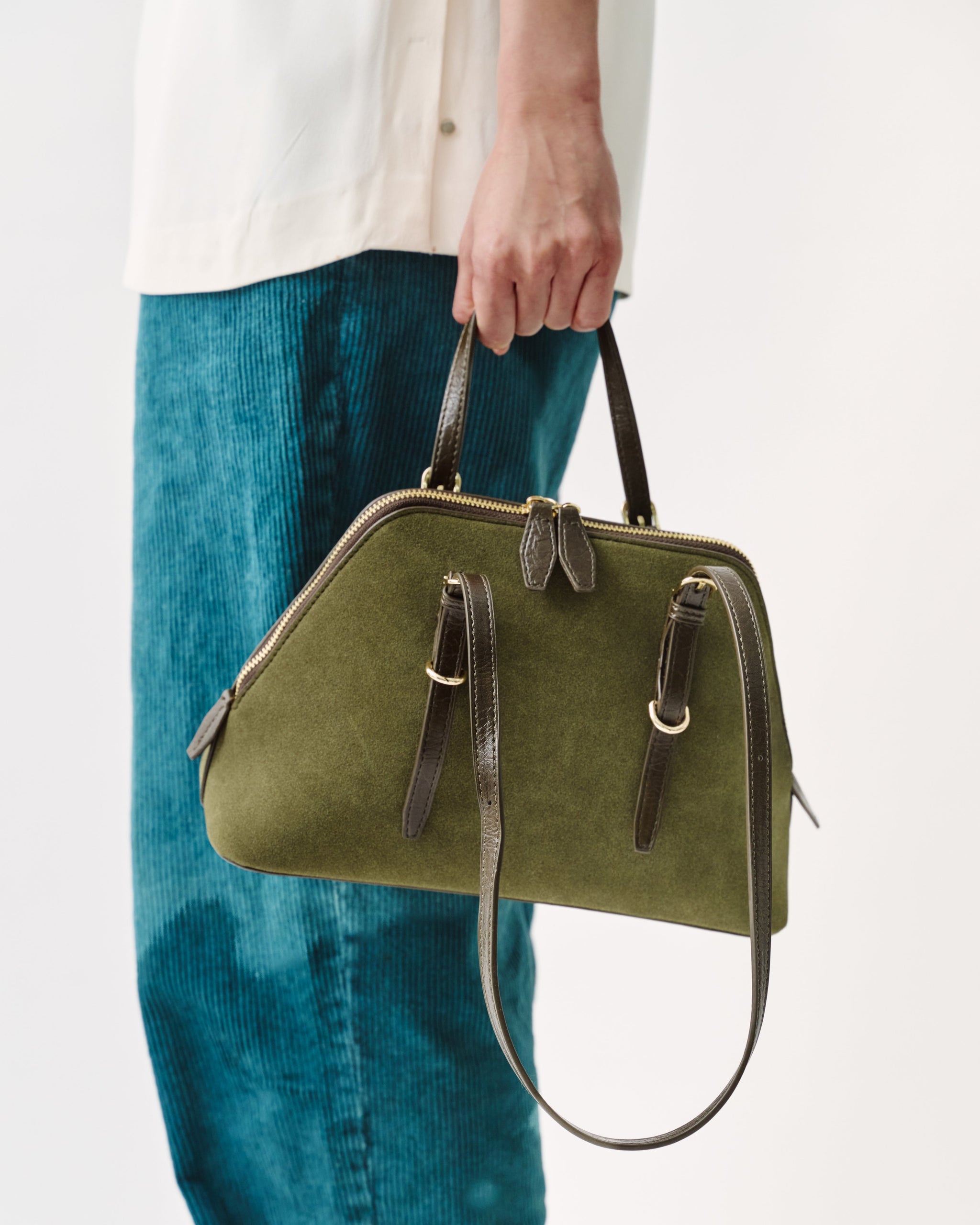 Crafted in oil-resistant suede for daily practicality, the NS01 barrel bag is designed to move from travel to visiting without losing structure. The adjustable straps allow two ways of carrying - by hand or worn over the shoulder.