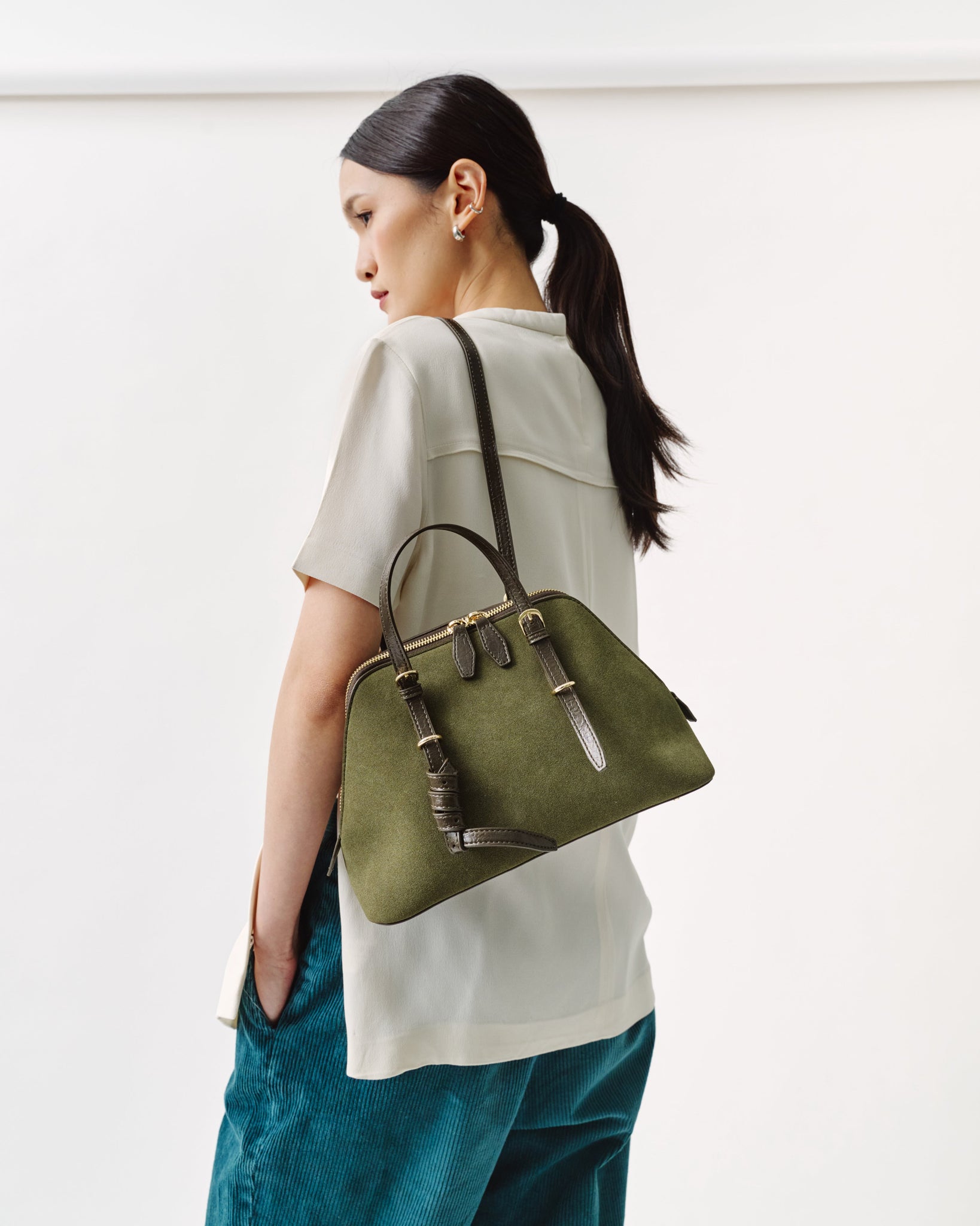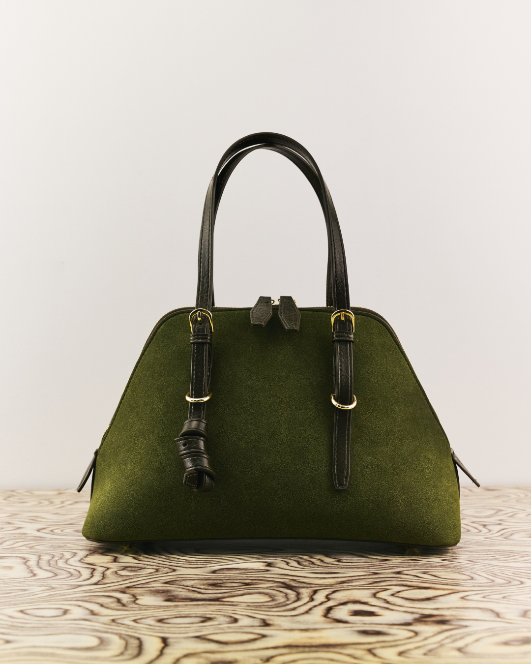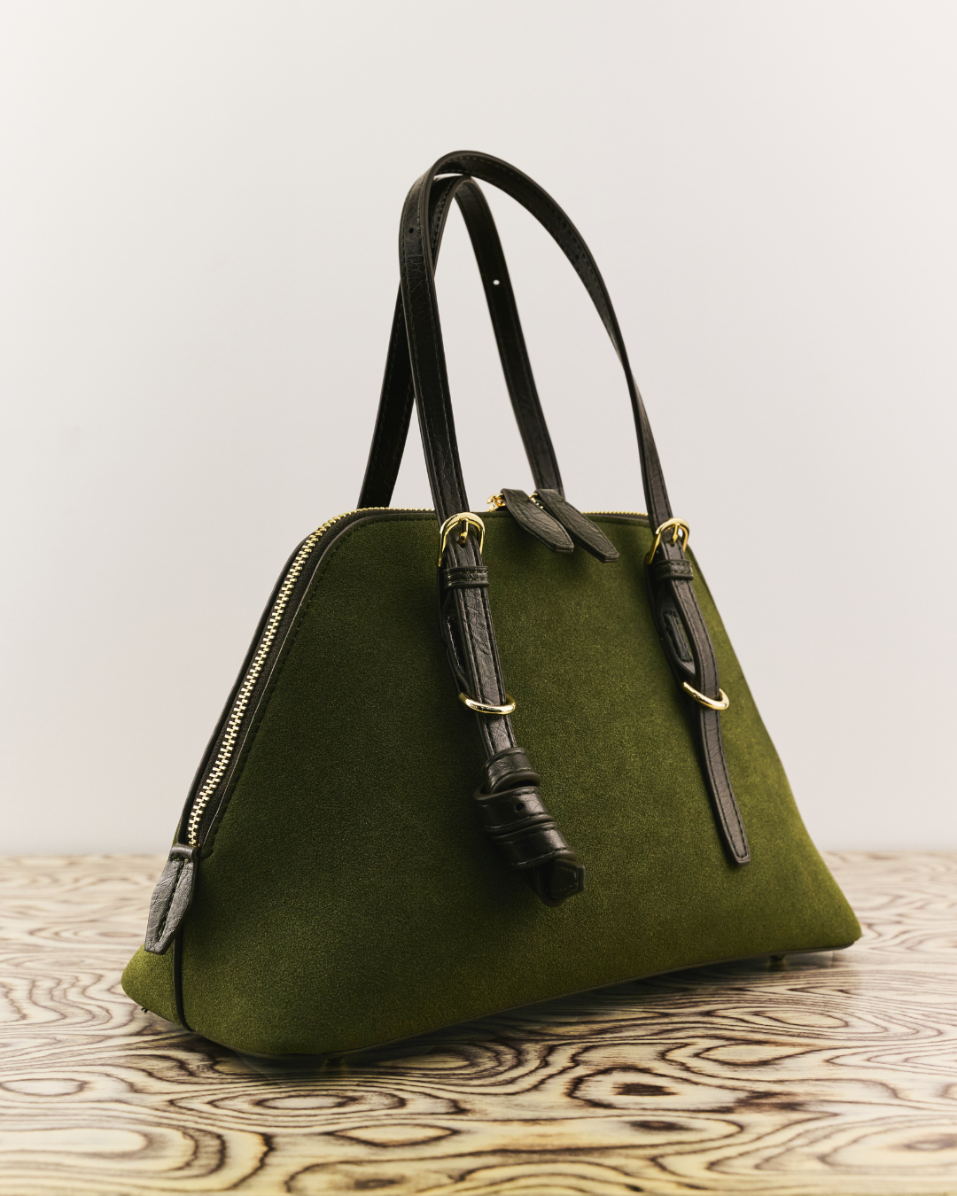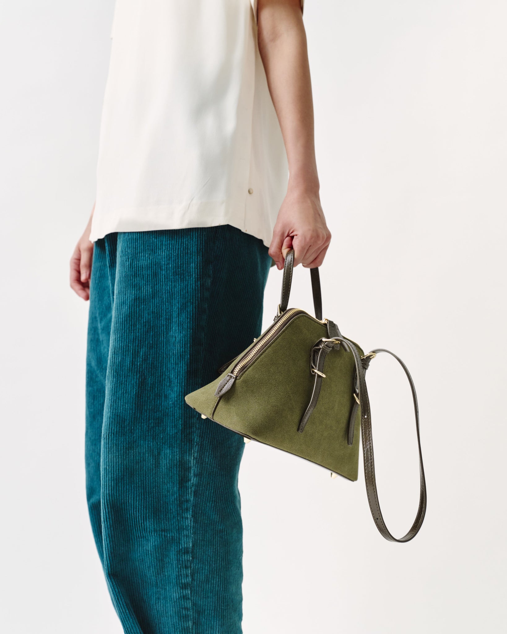 Crafted in oil-resistant suede for daily practicality, the NS01 barrel bag is designed to move from travel to visiting without losing structure. The adjustable straps allow two ways of carrying - by hand or worn over the shoulder.